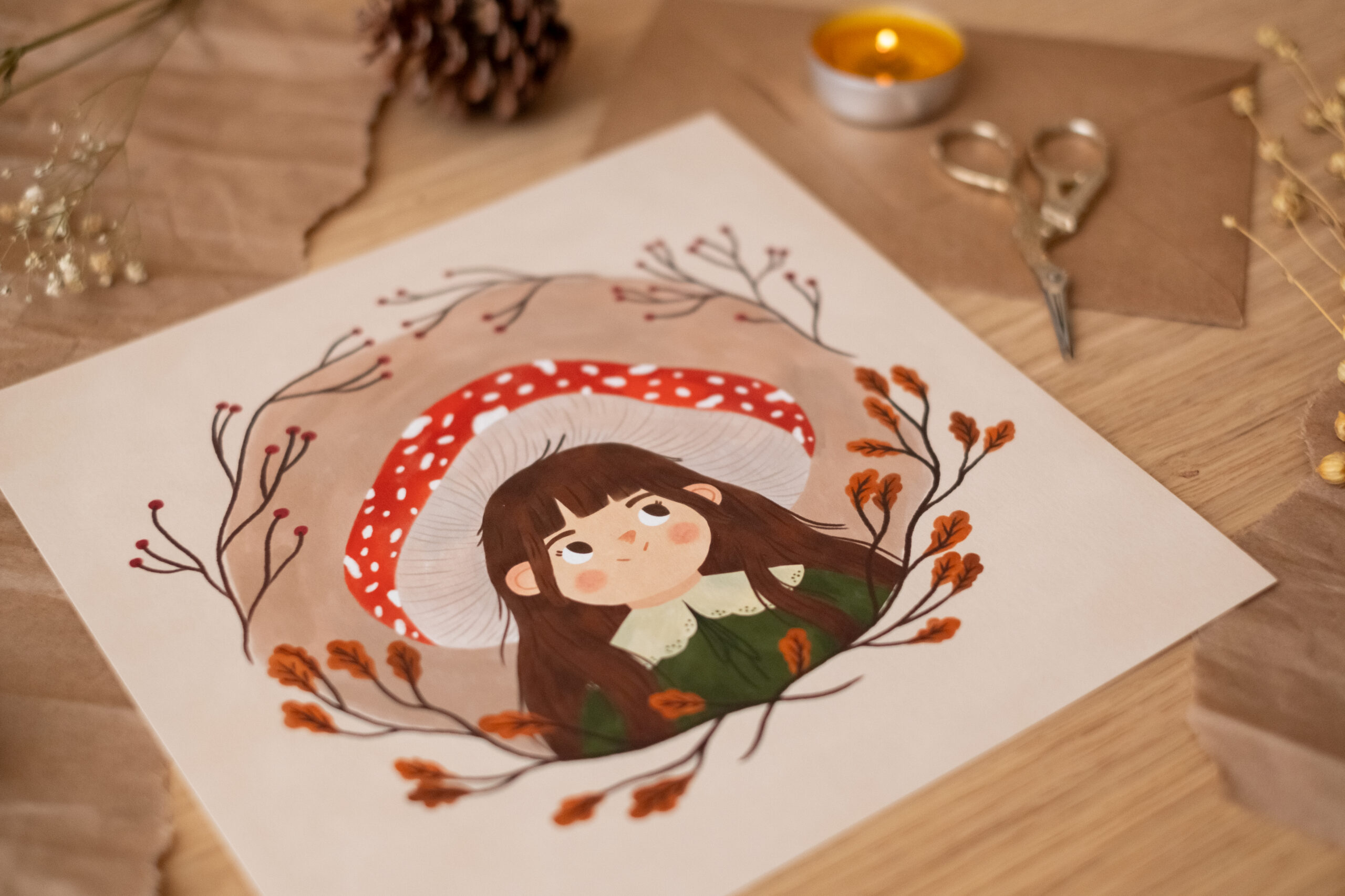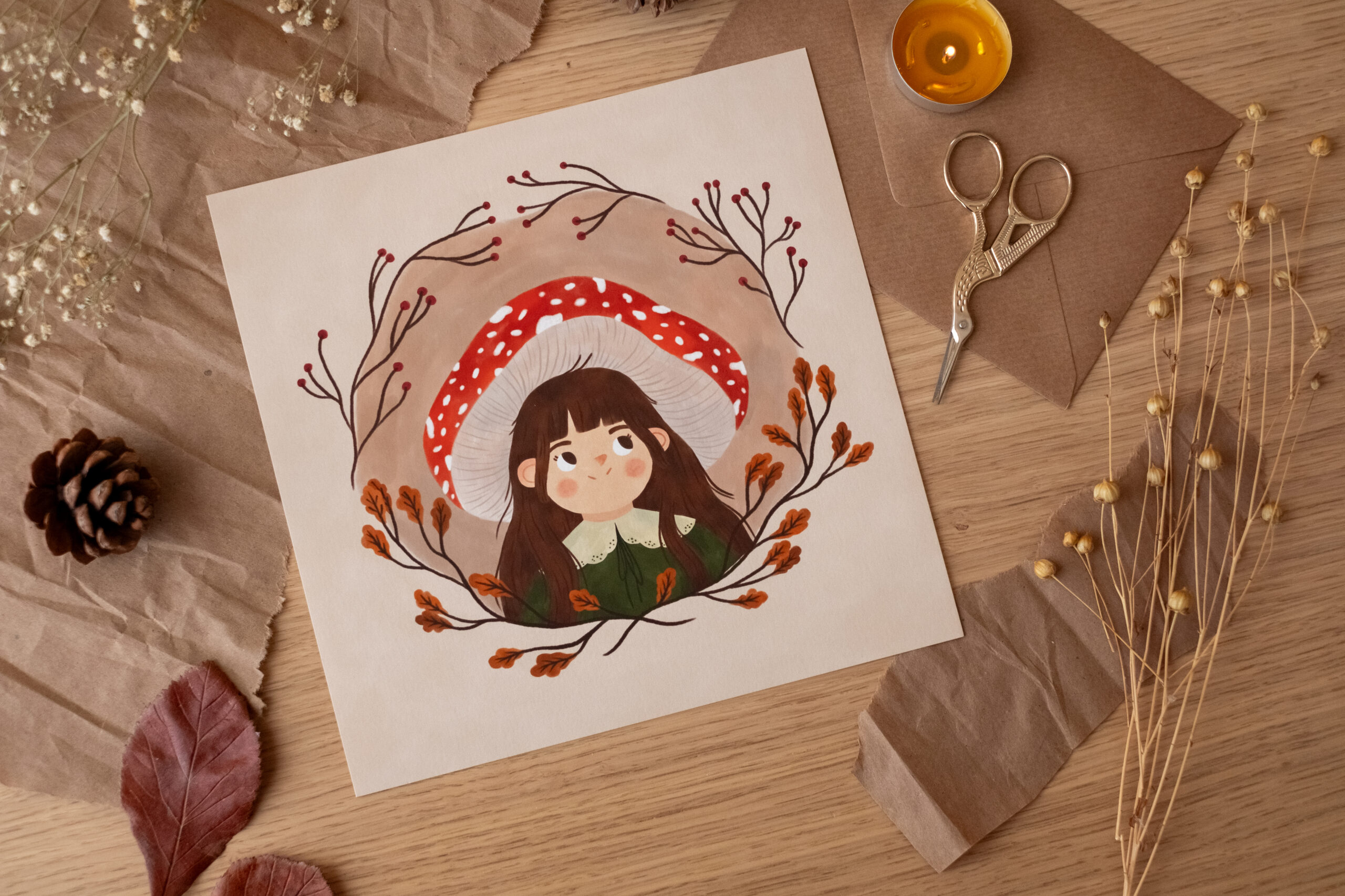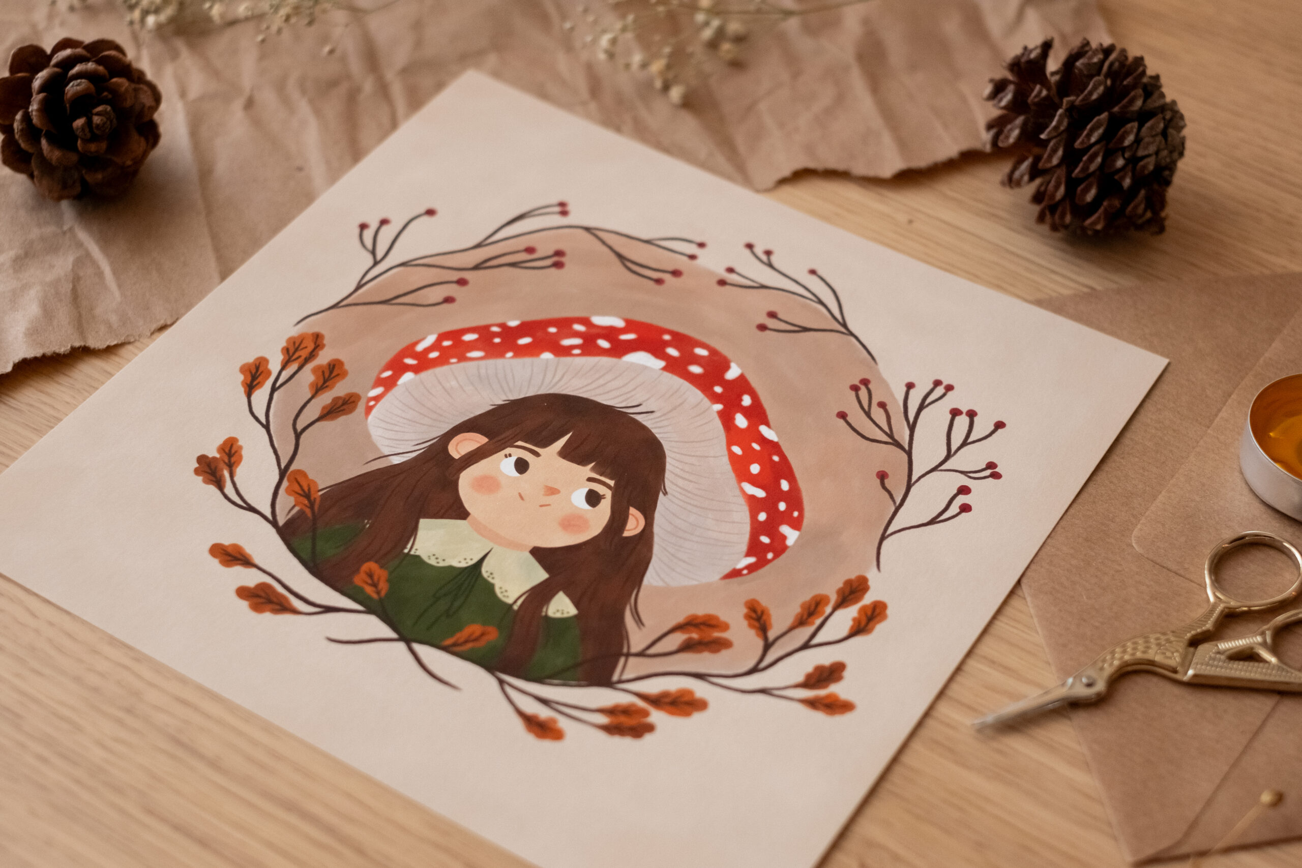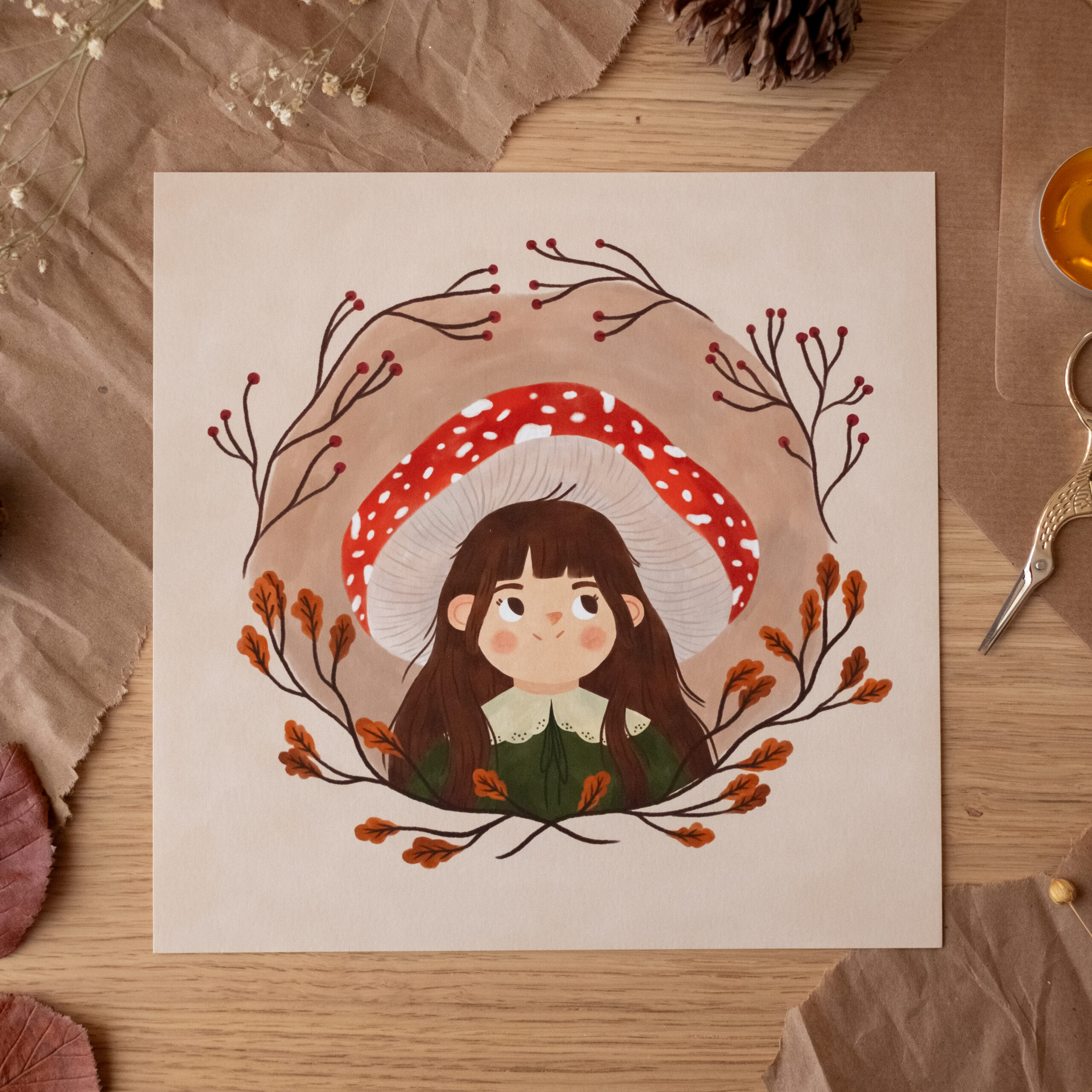 A veces, para entender la naturaleza, hay que convertirse en parte de ella. Esta ilustración nació de un deseo de mimetismo, de imaginar qué se siente al ser tan pequeña como para refugiarse bajo el sombrero de una seta y observar el mundo desde el silencio de las raíces. Es un homenaje a la curiosidad, a la mirada limpia y a esa conexión ancestral que nos une al bosque.