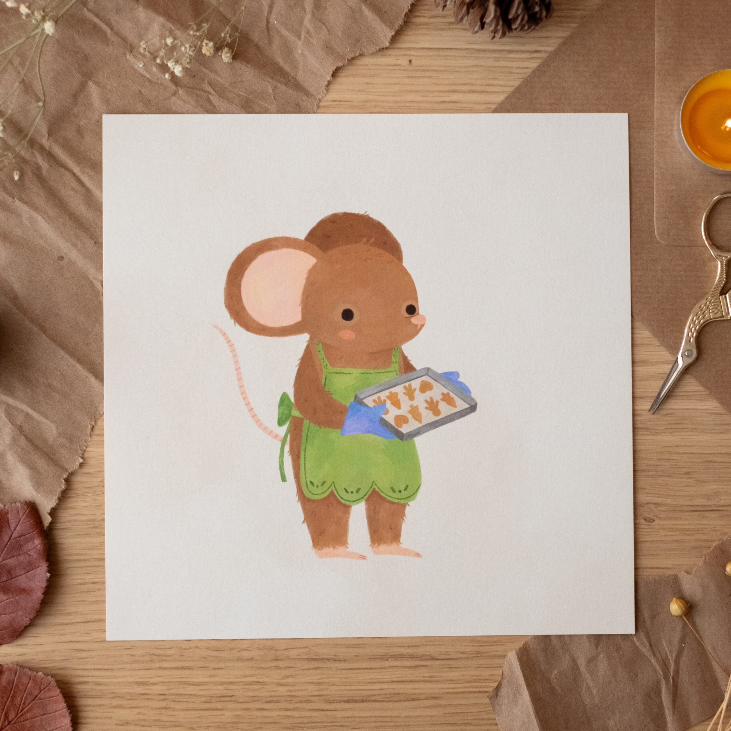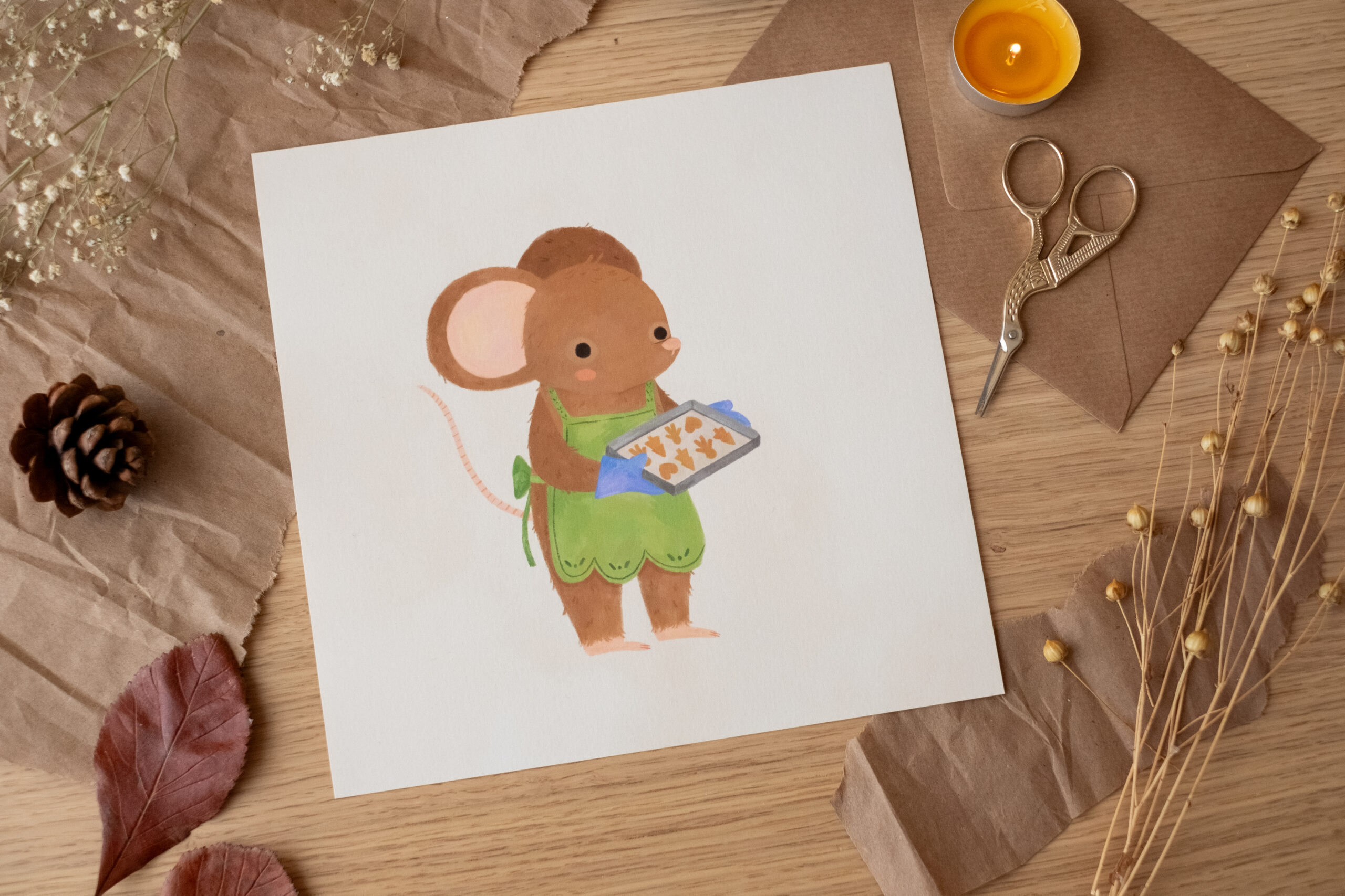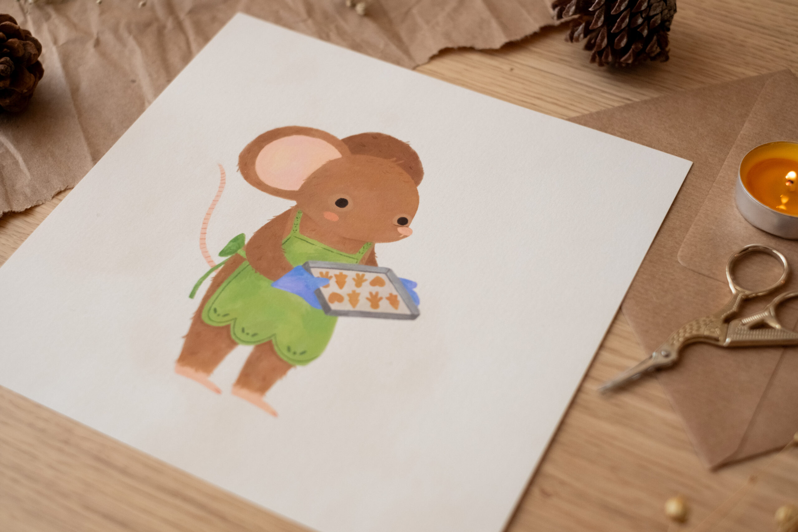 Hay días que se miden por el olor a galletas recién horneadas y el silencio de una cocina en calma. Esta ilustración nació de esos domingos de lluvia donde el mejor plan es ponerse el delantal y dedicar tiempo a las cosas pequeñas. El pequeño ratoncito, con sus manoplas azules y sus galletas de zanahoria, es un homenaje a la repostería hecha con paciencia y al cariño que ponemos en aquello que compartimos con los demás.