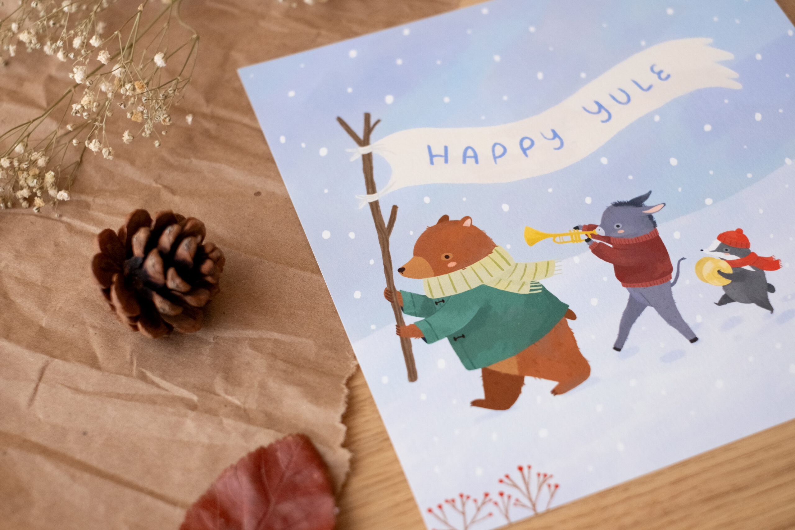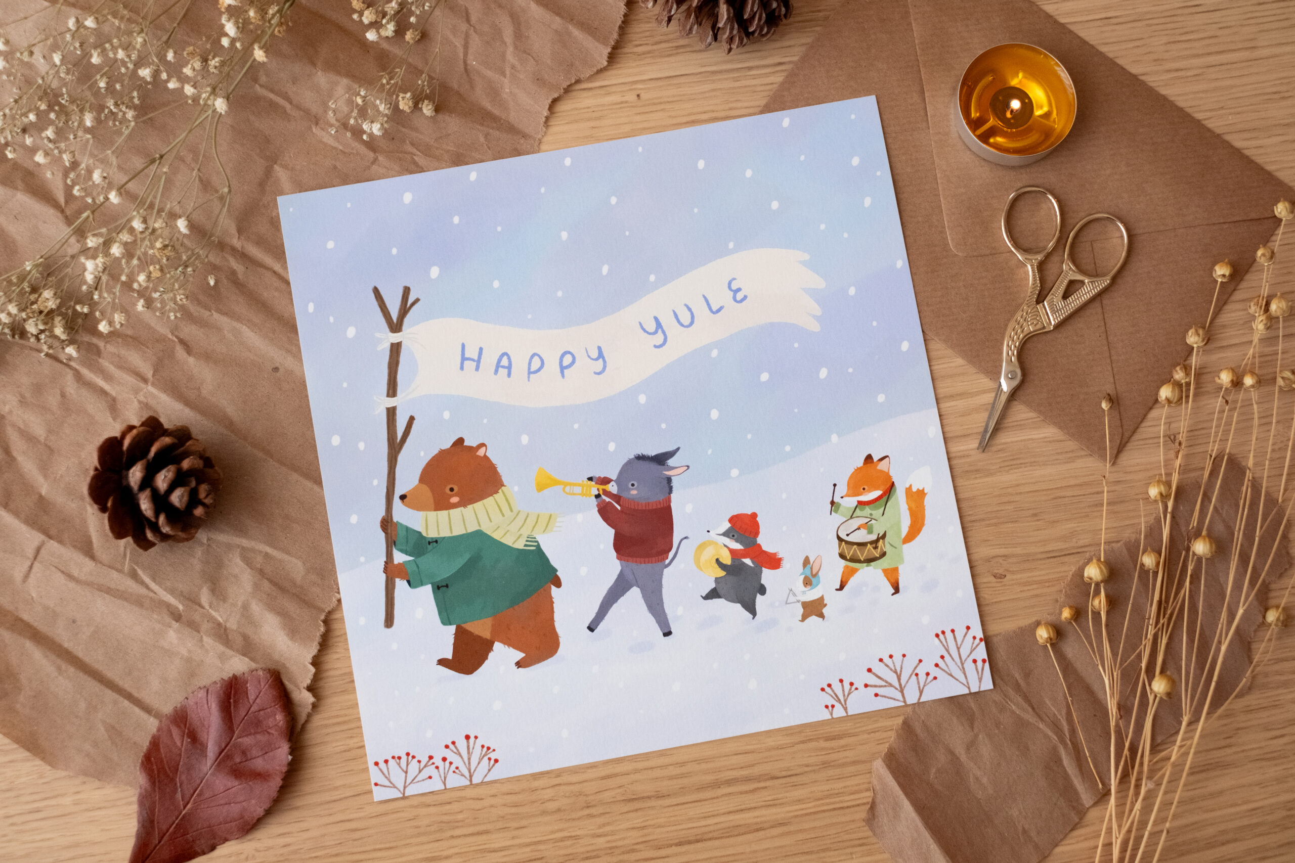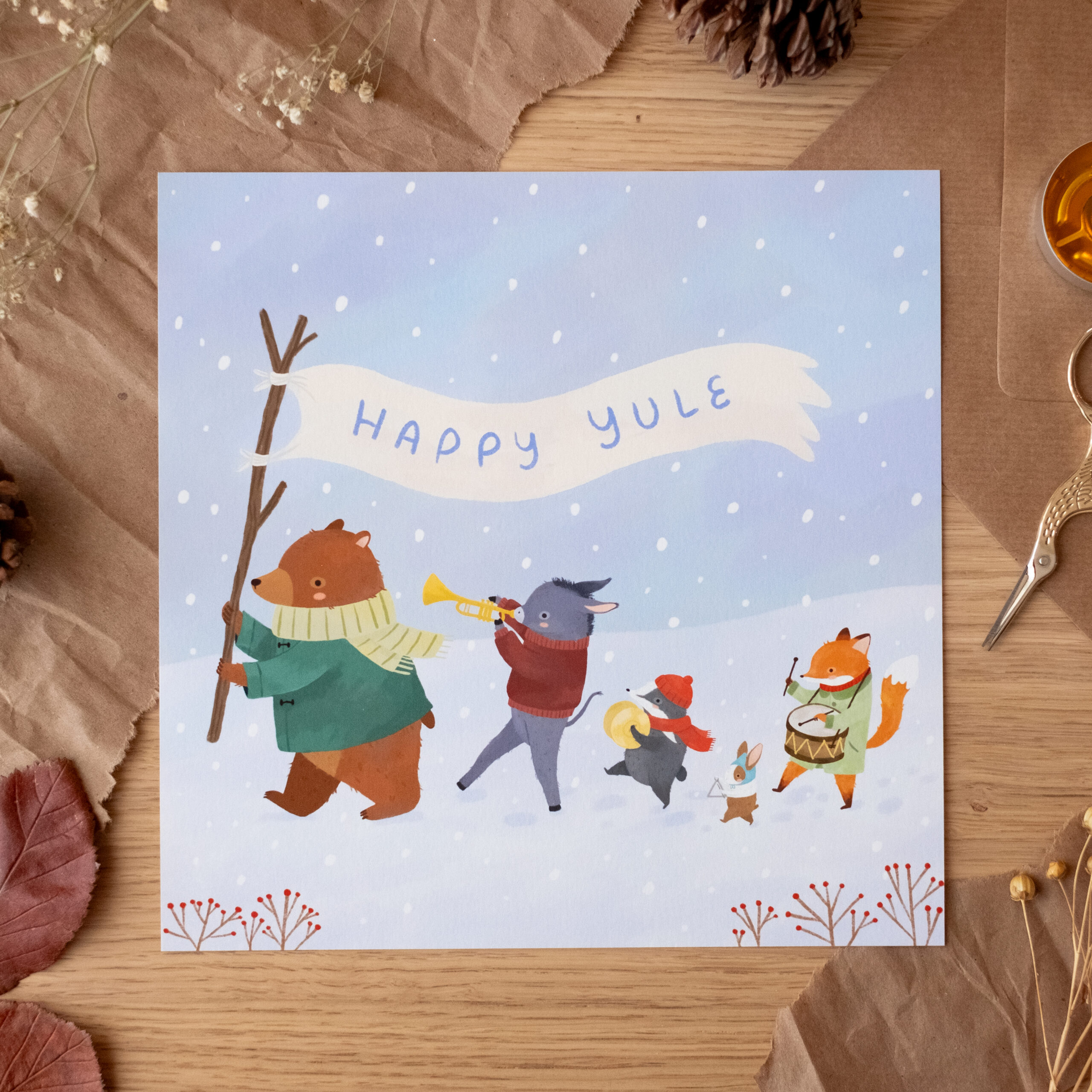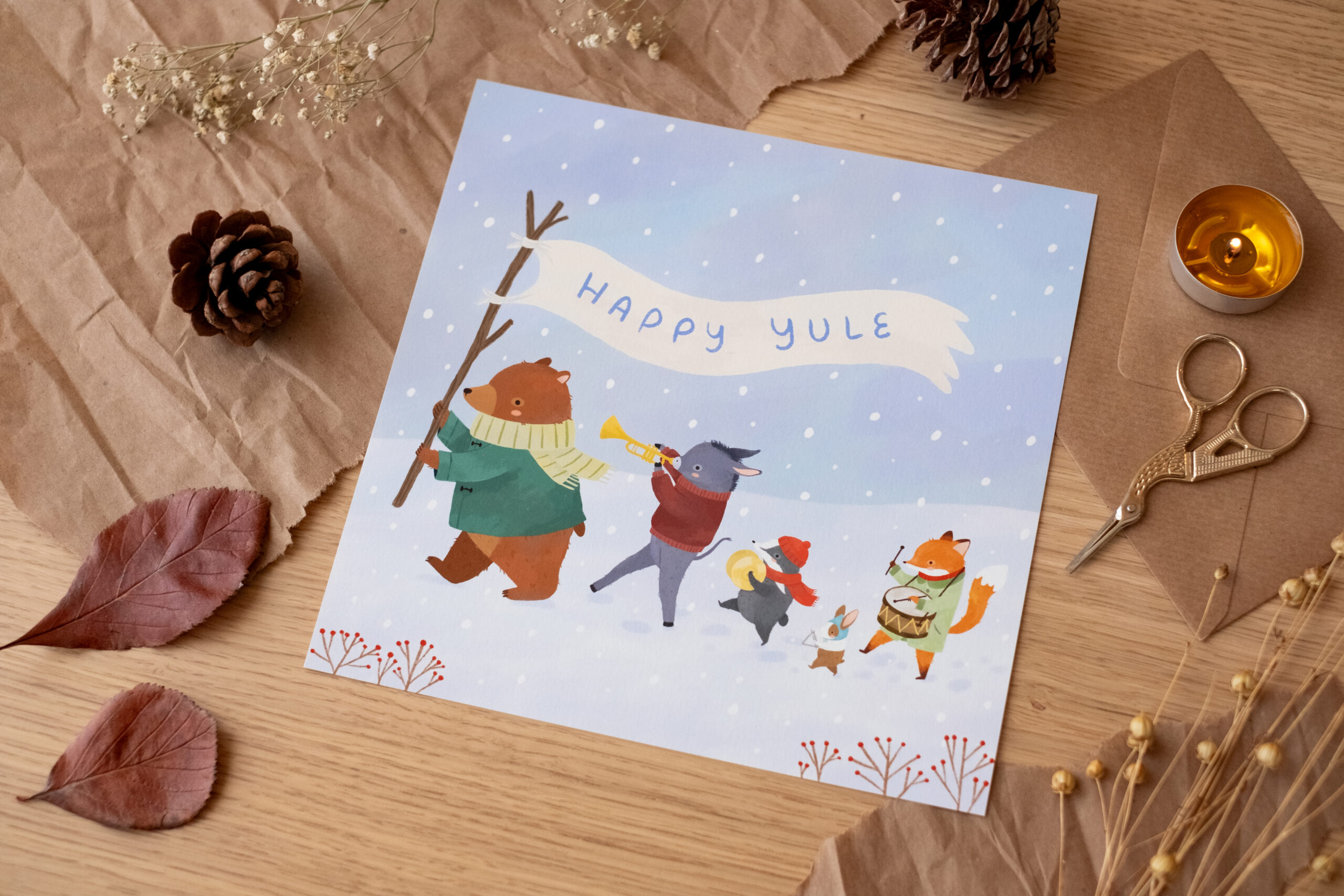 Cuando el invierno llega a su punto más profundo, la naturaleza se prepara para el renacimiento. Esta ilustración es una pequeña celebración del solsticio de invierno, de la tradición de Yule y de la alegría de saber que, incluso en los días más fríos y oscuros, la luz siempre acaba regresando. El oso, el burro, el tejón, el pequeño ratón y el zorro desfilan juntos por la nieve, recordándonos que el invierno es mejor si se transita en compañía.