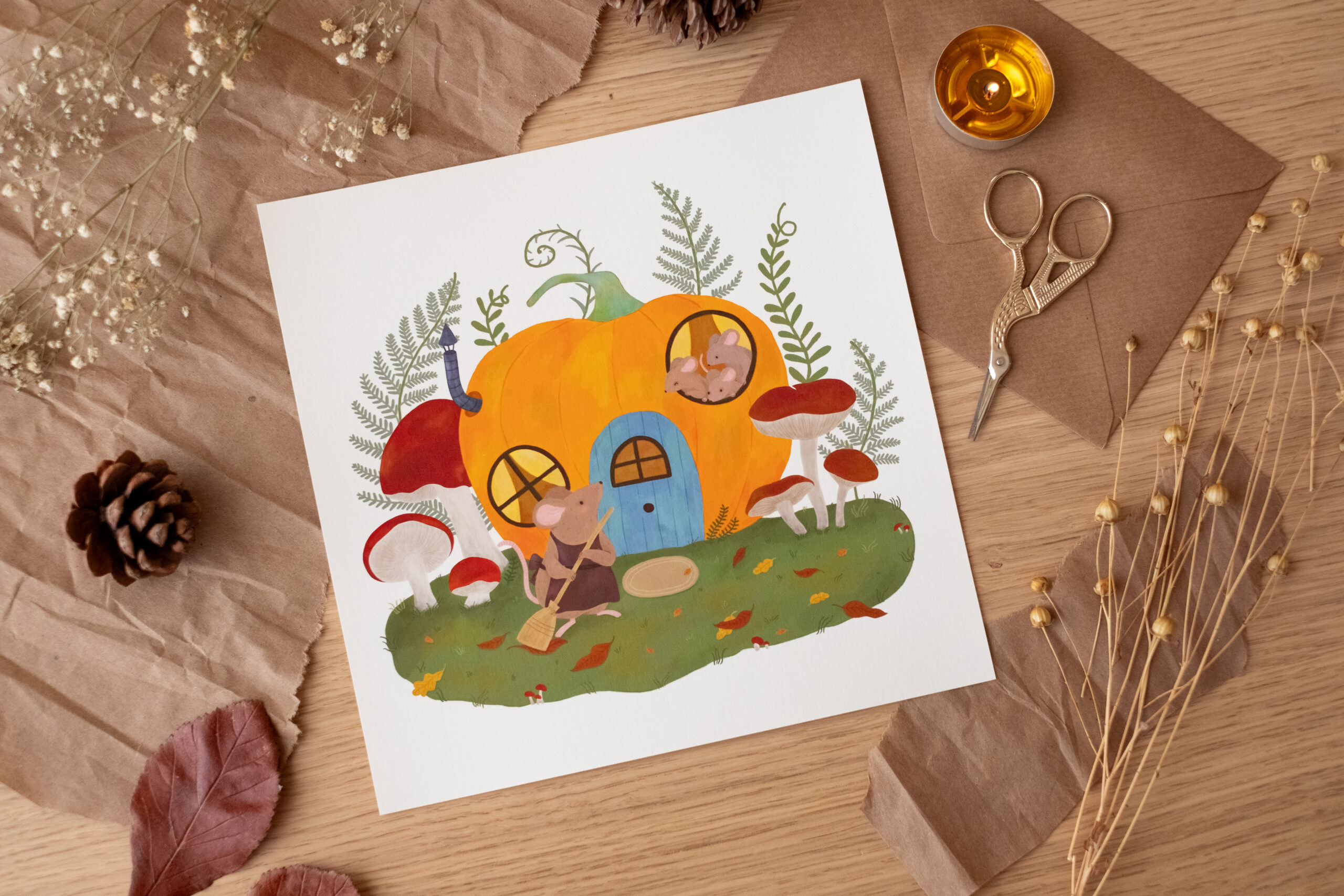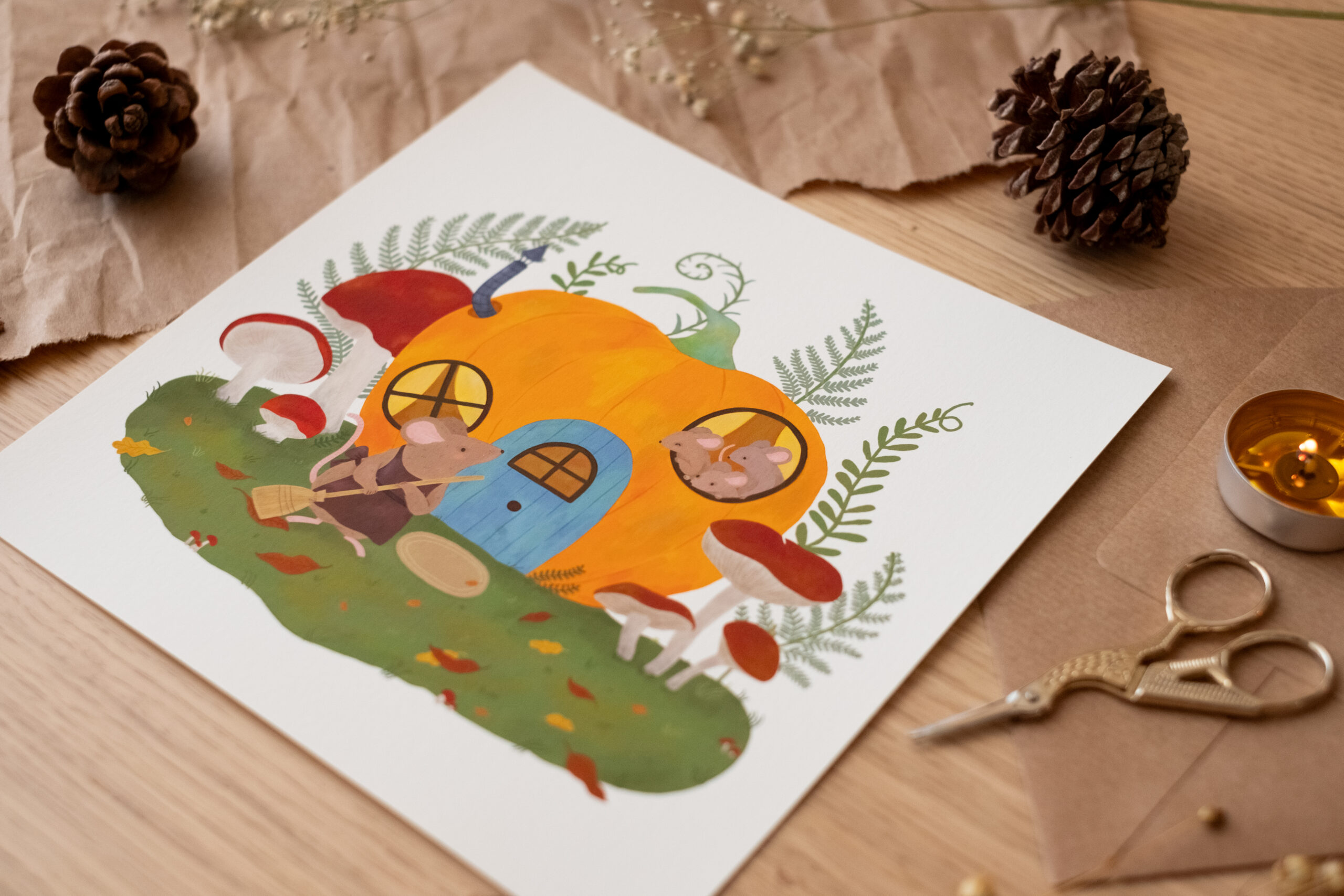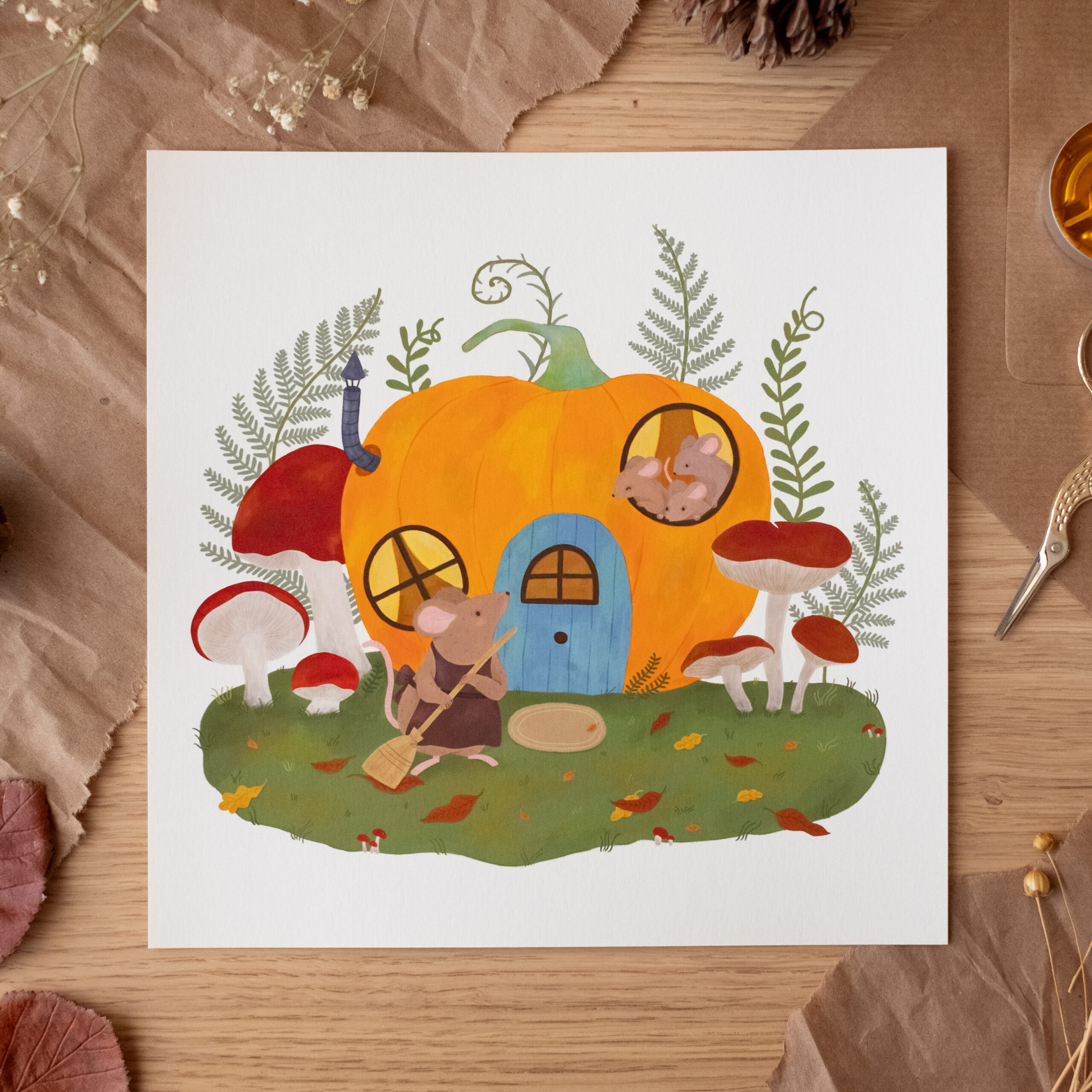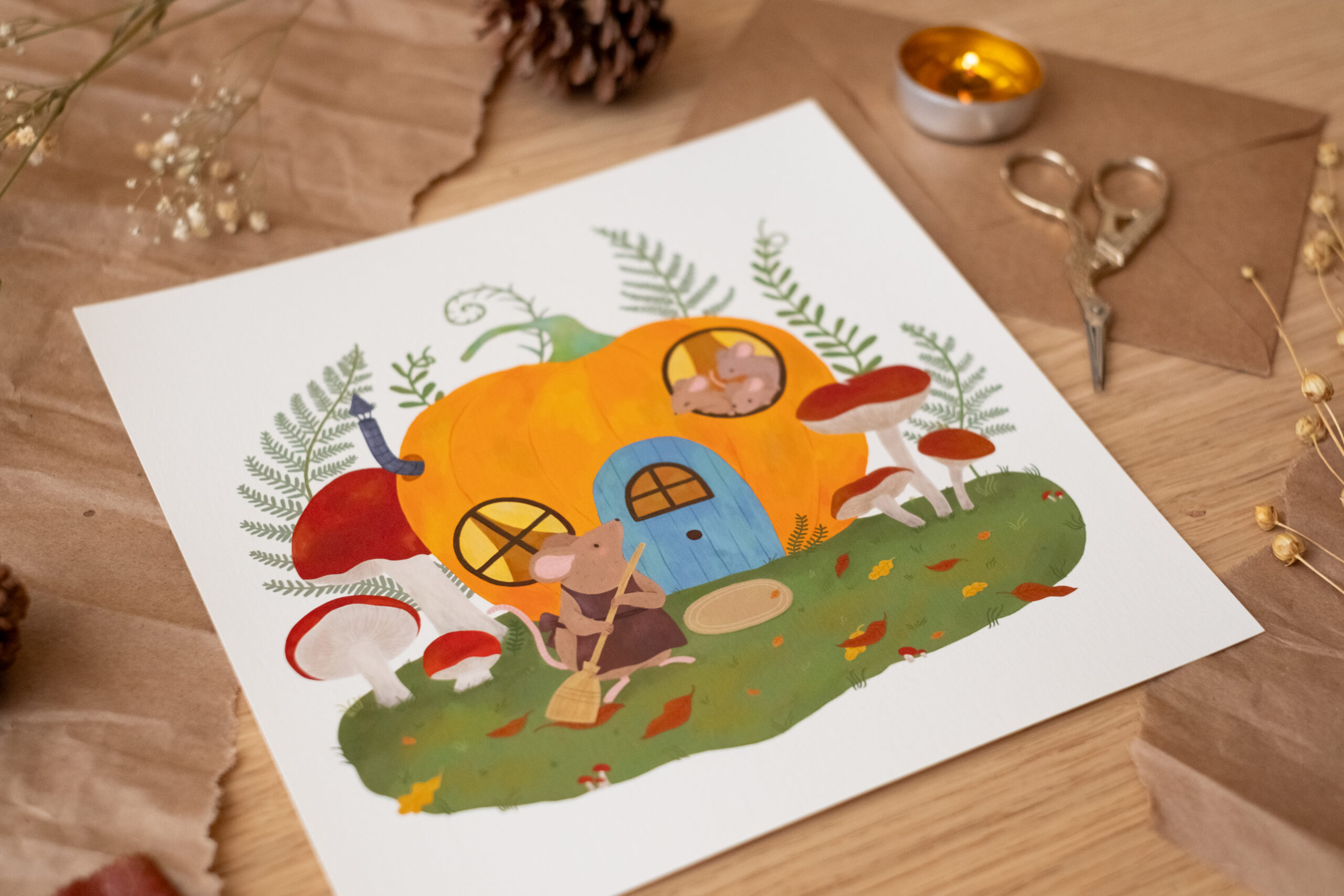 A veces, el hogar no es un lugar grande, sino aquel donde te sientes protegida. Esta ilustración nació del deseo de imaginar qué ocurre en los rincones escondidos de un jardín cuando nadie mira. Es un homenaje a la vida sencilla, al cuidado de los detalles y a la calidez de una casa que, aunque sea una calabaza, está llena de vida y de historias que se cuentan al calor de una chimenea diminuta.