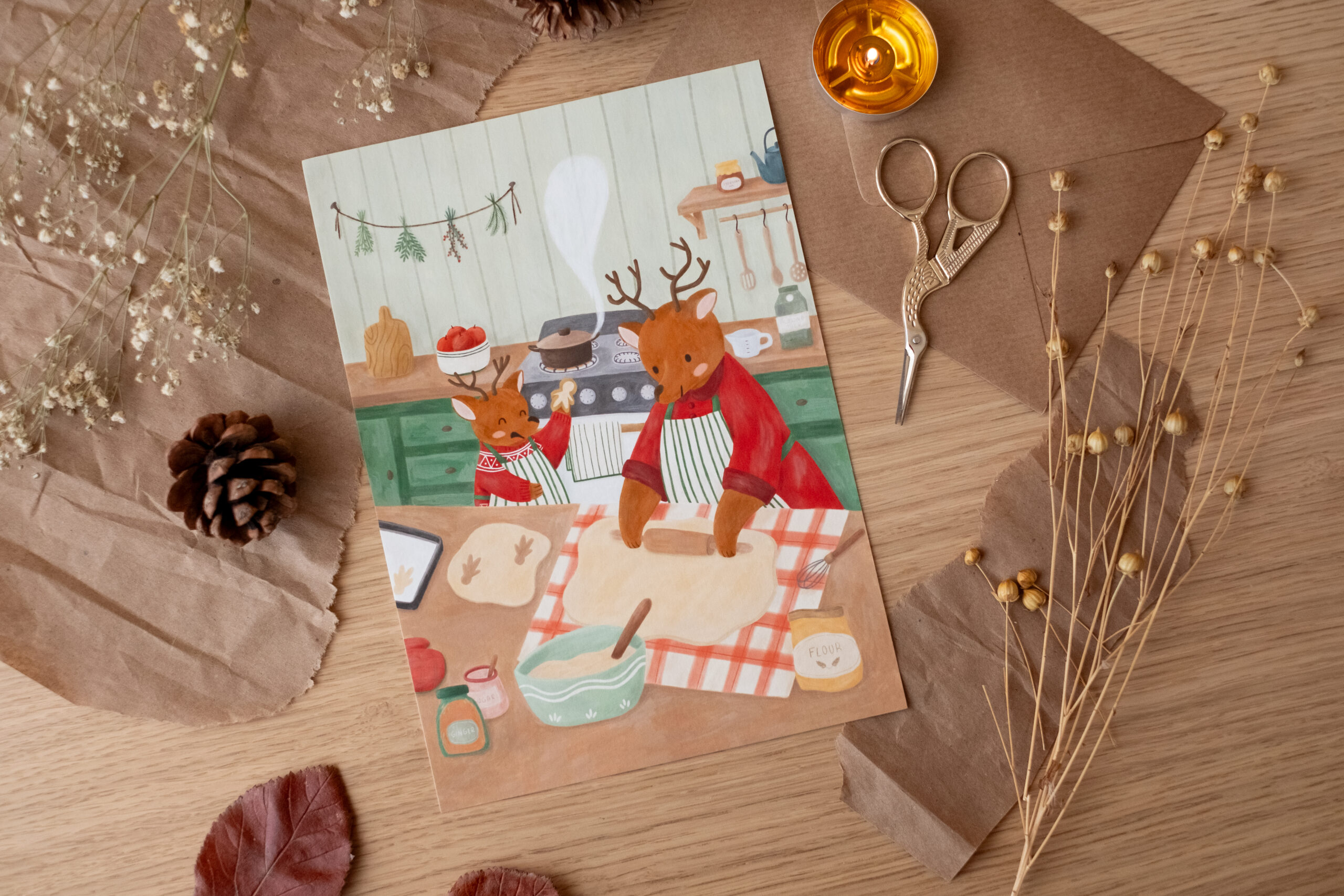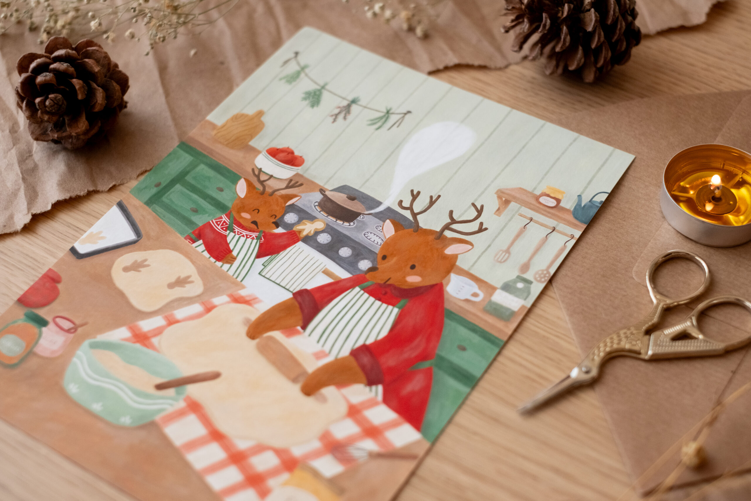 Hay recuerdos que huelen a canela y se sienten como el calor de un horno encendido. Esta ilustración nació de esos momentos compartidos en la cocina, donde lo de menos es el resultado y lo más importante es el proceso: las manos manchadas de harina, las risas por una galleta con forma extraña y el silencio cómplice de quien enseña con paciencia. Los dos ciervos, concentrados en su labor, son un homenaje a la transmisión de los saberes cotidianos y al amor que se amasa lentamente.