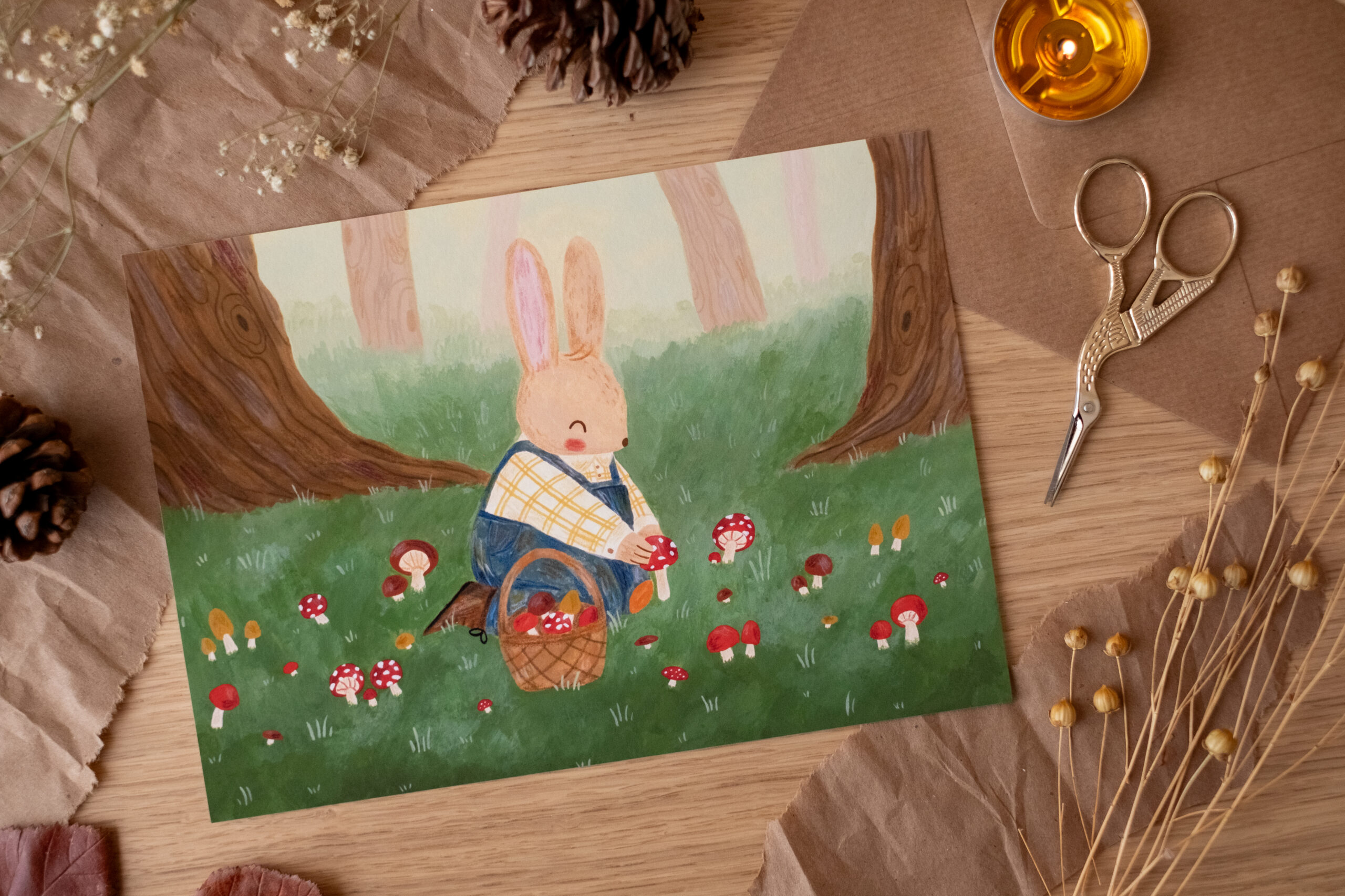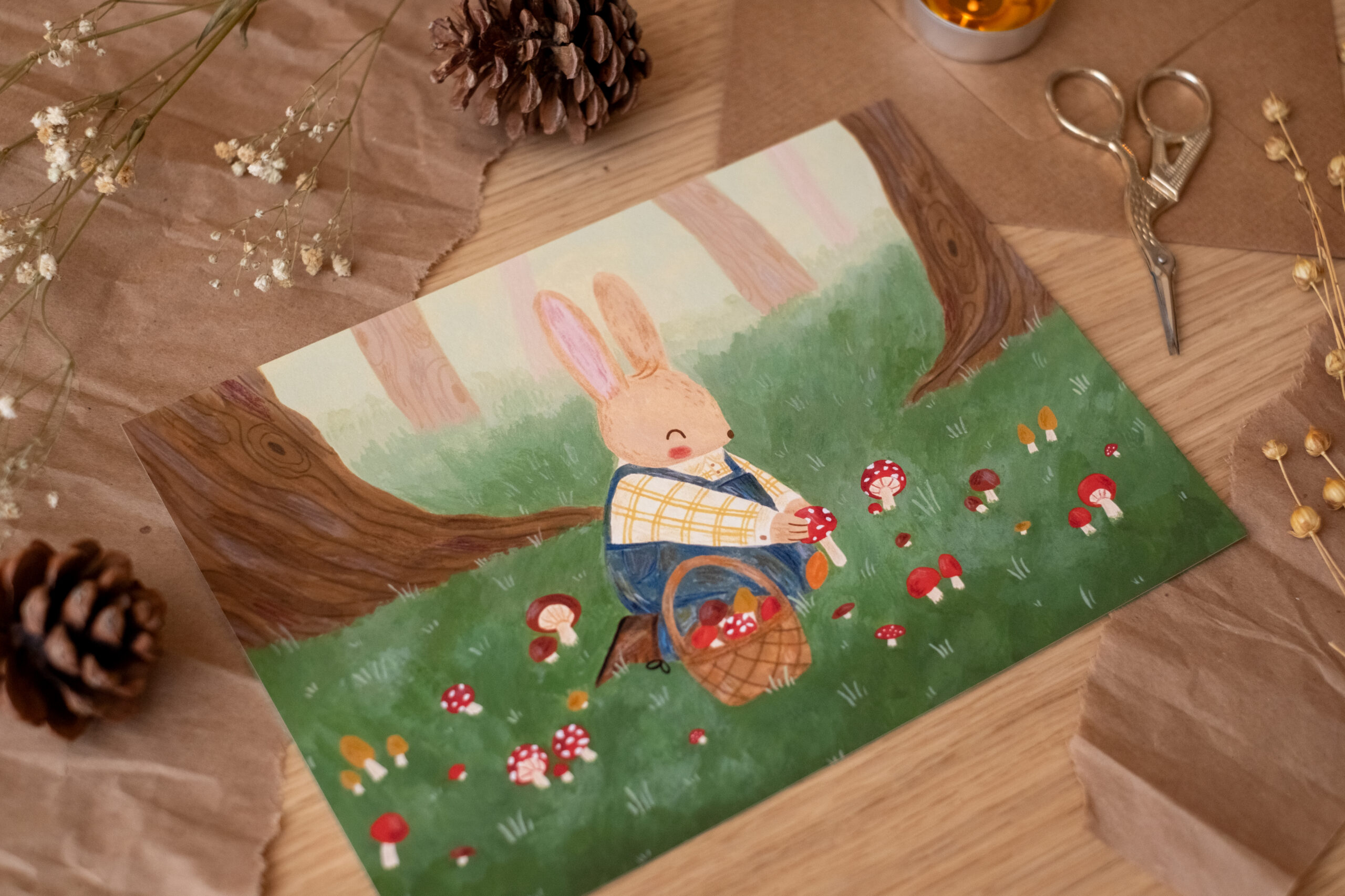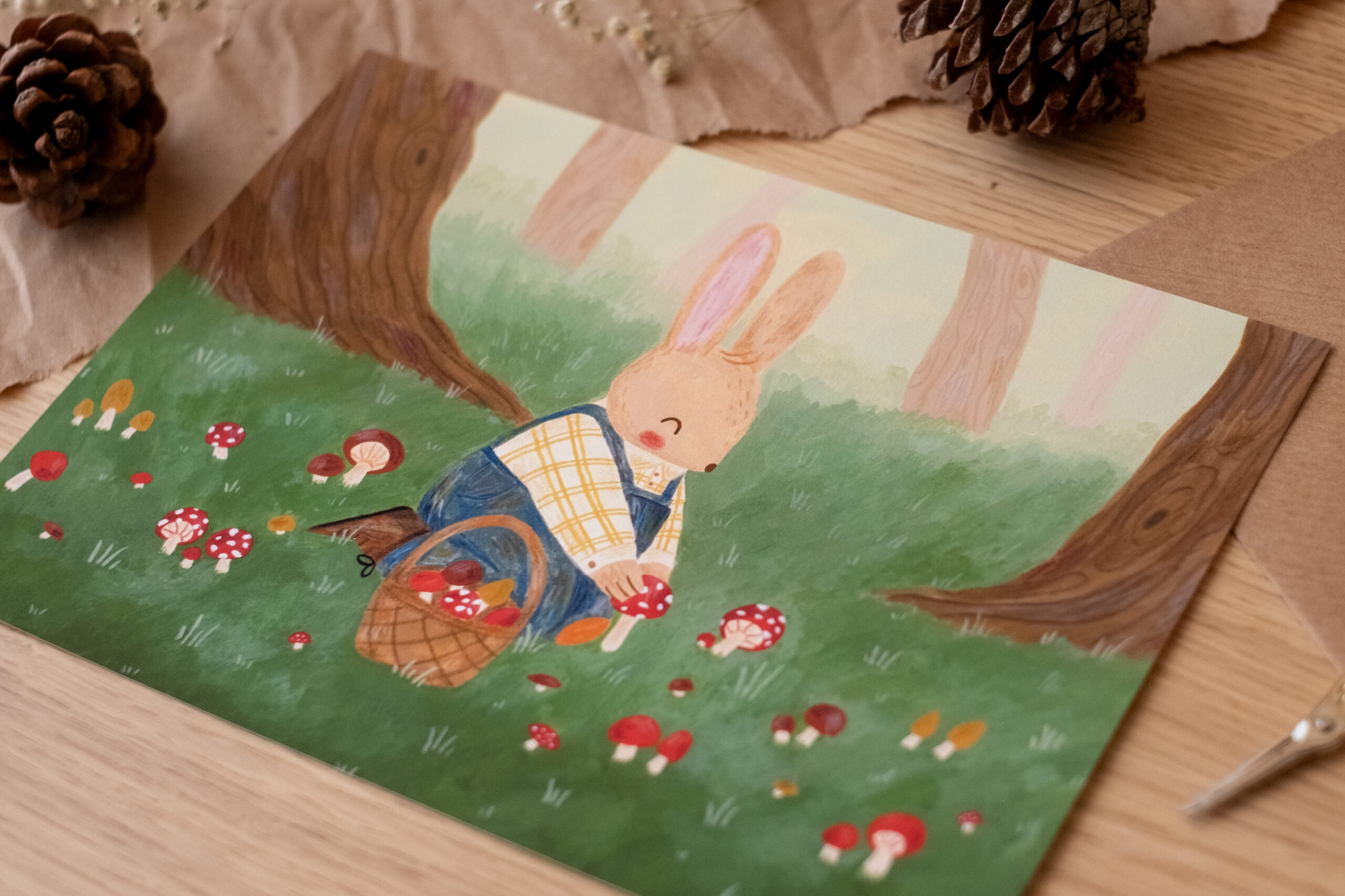 Hay tesoros que no brillan, sino que nacen del silencio y la humedad tras la lluvia. Esta ilustración nació de esos paseos donde la vista se agudiza para encontrar pequeños puntos rojos entre el verde. El conejo, con su peto de cuadros y su cesta de mimbre, representa la paciencia de quien sabe esperar el momento justo y la alegría de encontrar belleza en lo salvaje.