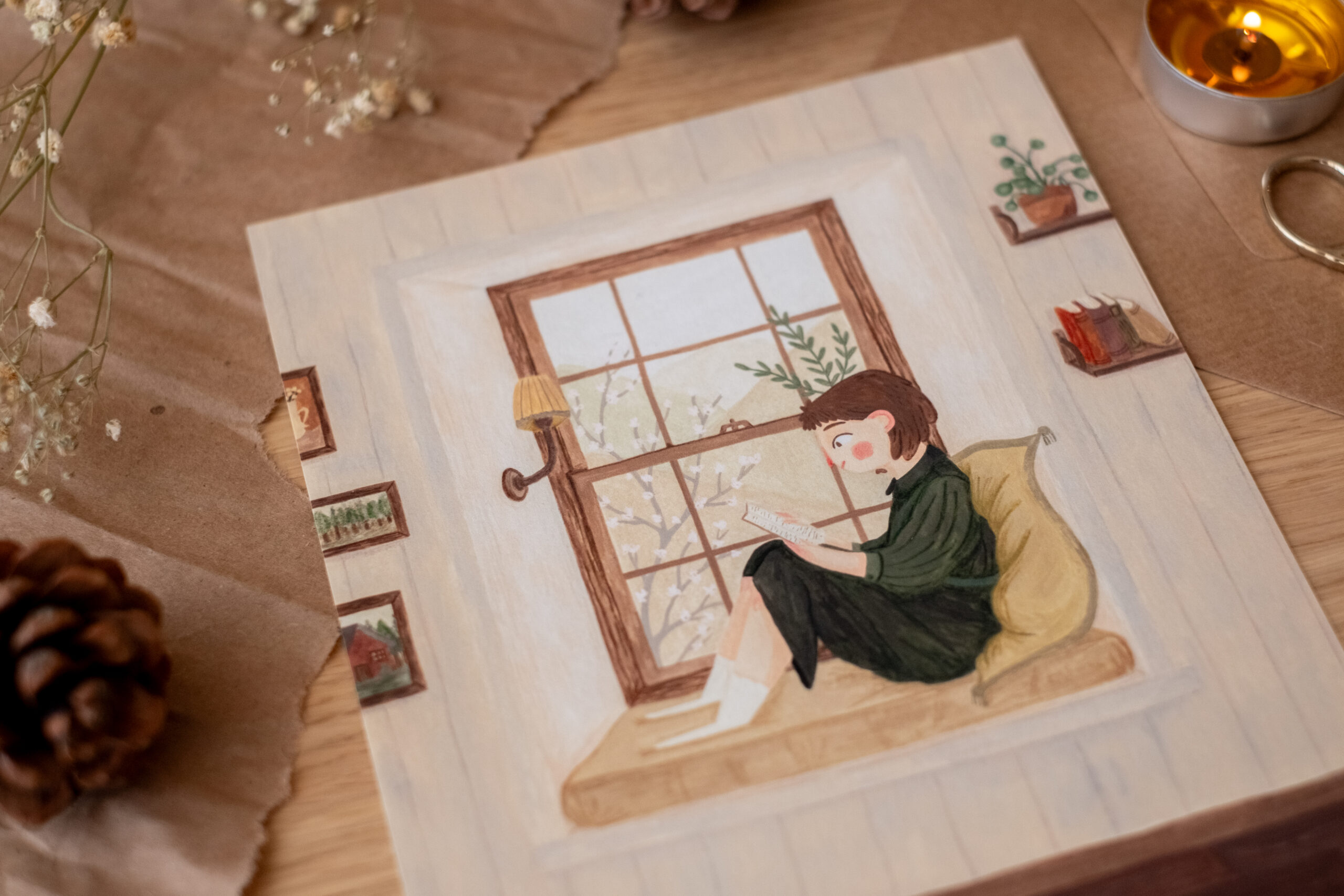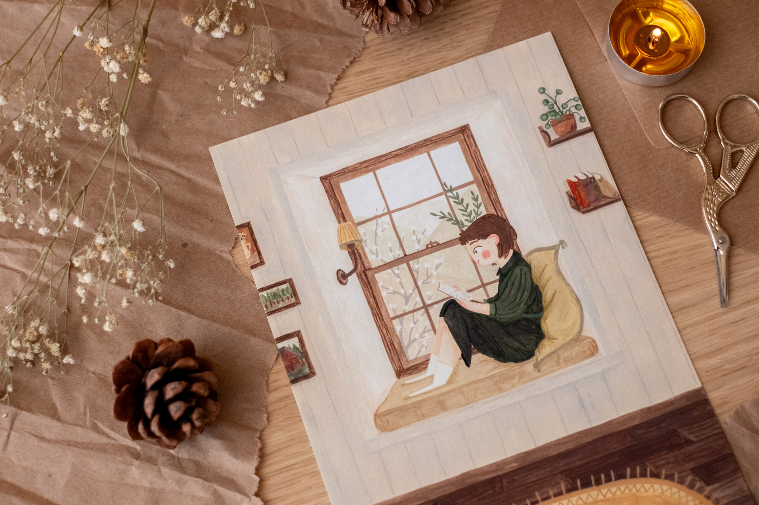 Hay una paz que solo se encuentra entre las páginas de un libro y el silencio de un rincón propio. Esta ilustración nació de ese anhelo por los días de lluvia o de luz suave, donde el único plan es sentarse a observar cómo cambia el paisaje tras el cristal mientras te sumerges en otra historia. La chica en su rincón, rodeada de sus libros y plantas, es el reflejo de nuestro propio santuario interior.